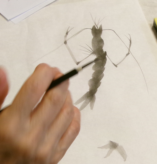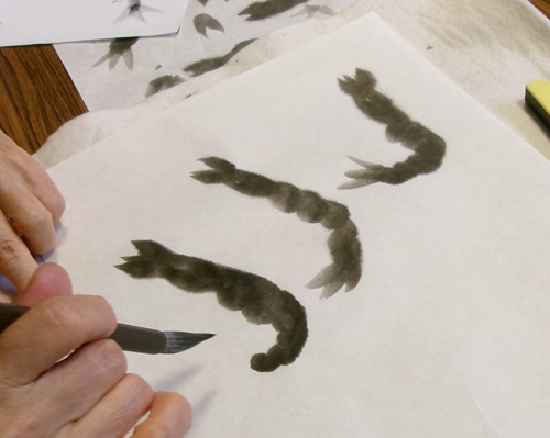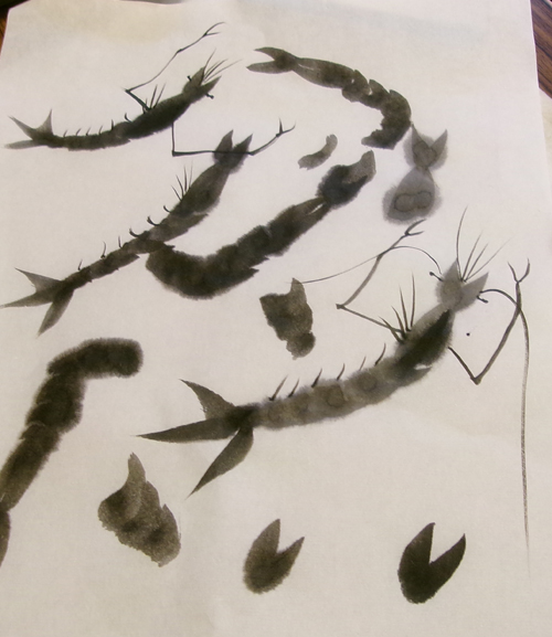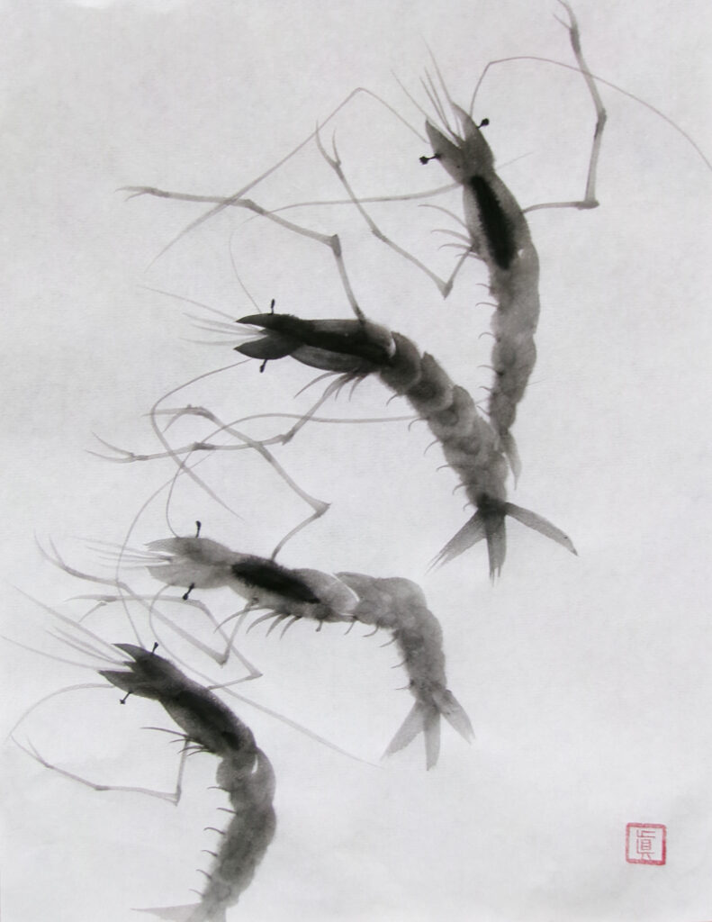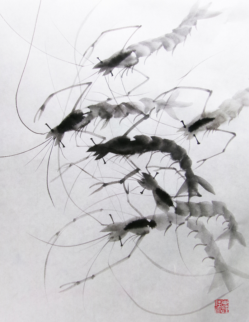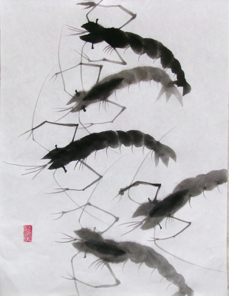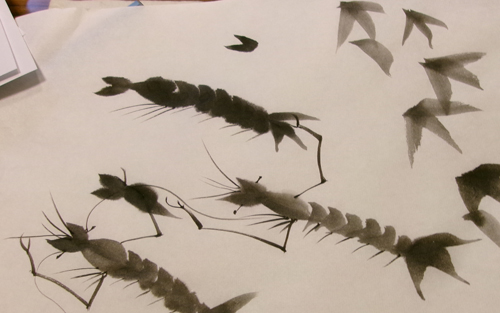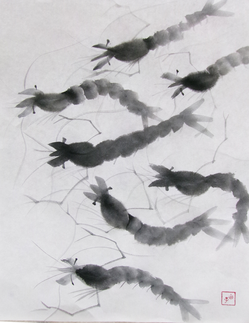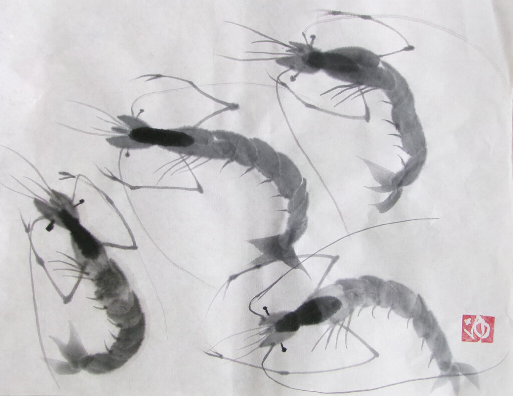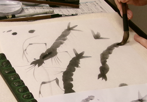 墨絵の会(千葉)2025.07~: Sumi-e class ~瀬知が講師をやっている墨絵の会の受講生作品、教室の稽古風景を紹介します~ 10月は「手長海老」を描きました。斉白石の作品集を見て勉強しました。たくさん描いて面白い作品になりました。 9月は栗を描きました。栗はかわいいです。まだまだ暑い日が続いていますが絵の中に秋が訪れました。 8月はとうもろこしを描きました。トウモロコシの太さがポイントの一つですね。仕上げの清書は二層画仙紙に描いていただきました。 7月は朝顔を描きました。花びらのグラデーションが美しいです。 Share: Twitter Facebook Google+